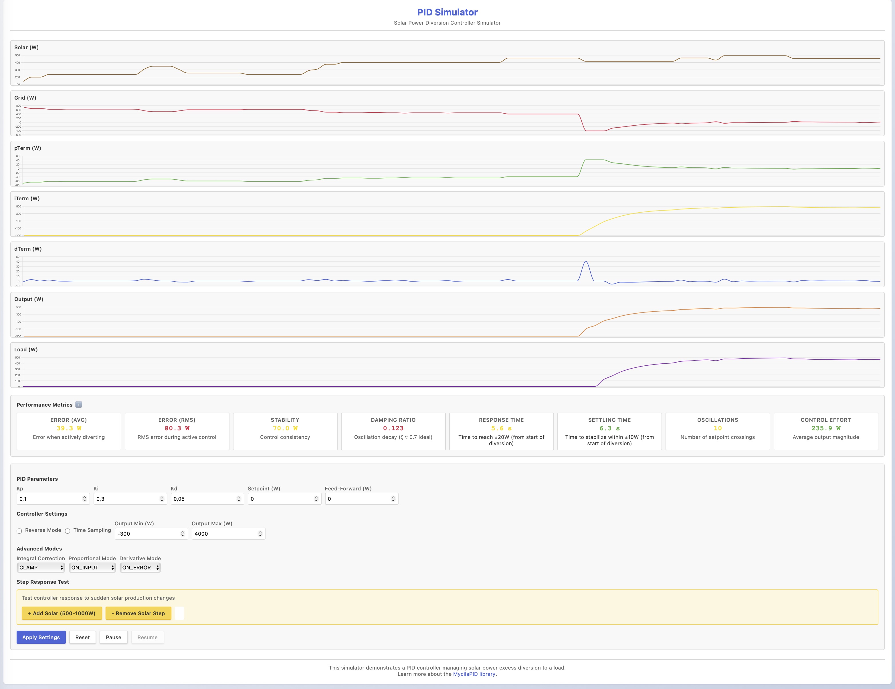 Whether measurements are frequent or not, the PID controller will try to adapt to the situation in order to smooth grid power and avoid as much as possible oscillations. If no measurement is received for a long time (2 seconds), the PID controller will be called again with the last measurement which will have the effect to slowly continuing to apply the same correction until a new measurement is received.