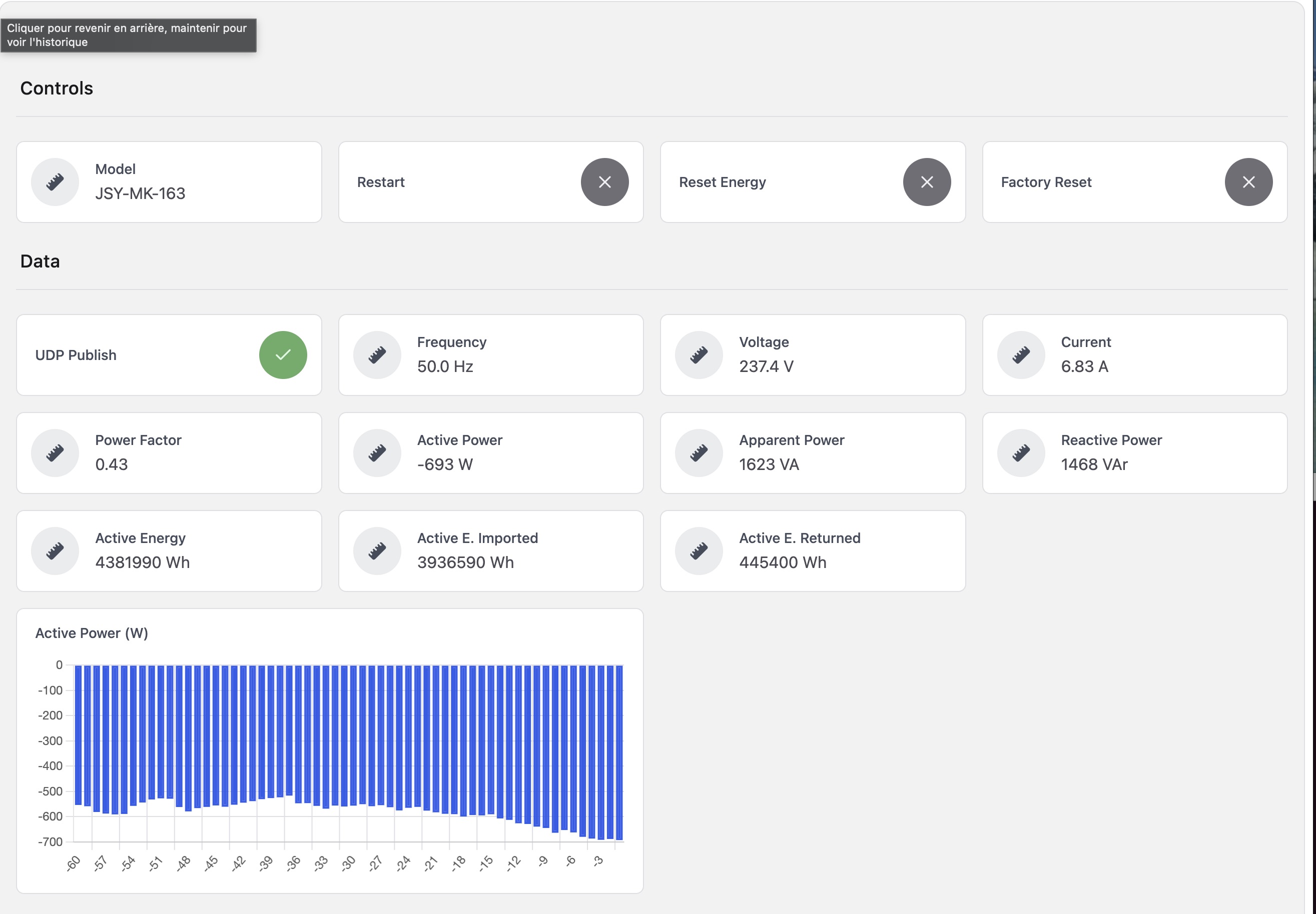 Power: Routed power.Apparent Power: Apparent power in VA circulating on the wires.Power Factor: Power factor (if lower than 1, mainly composed of harmonic component). Ideal is close to 1.Voltage: The dimmed RMS voltage sent to the resistive load.Current: The current in Amp sent to the resistive load.Resistance: The resistance of the load.Energy: The total accumulated energy routed by this output, stored in hardware (JSY and/or PZEM).